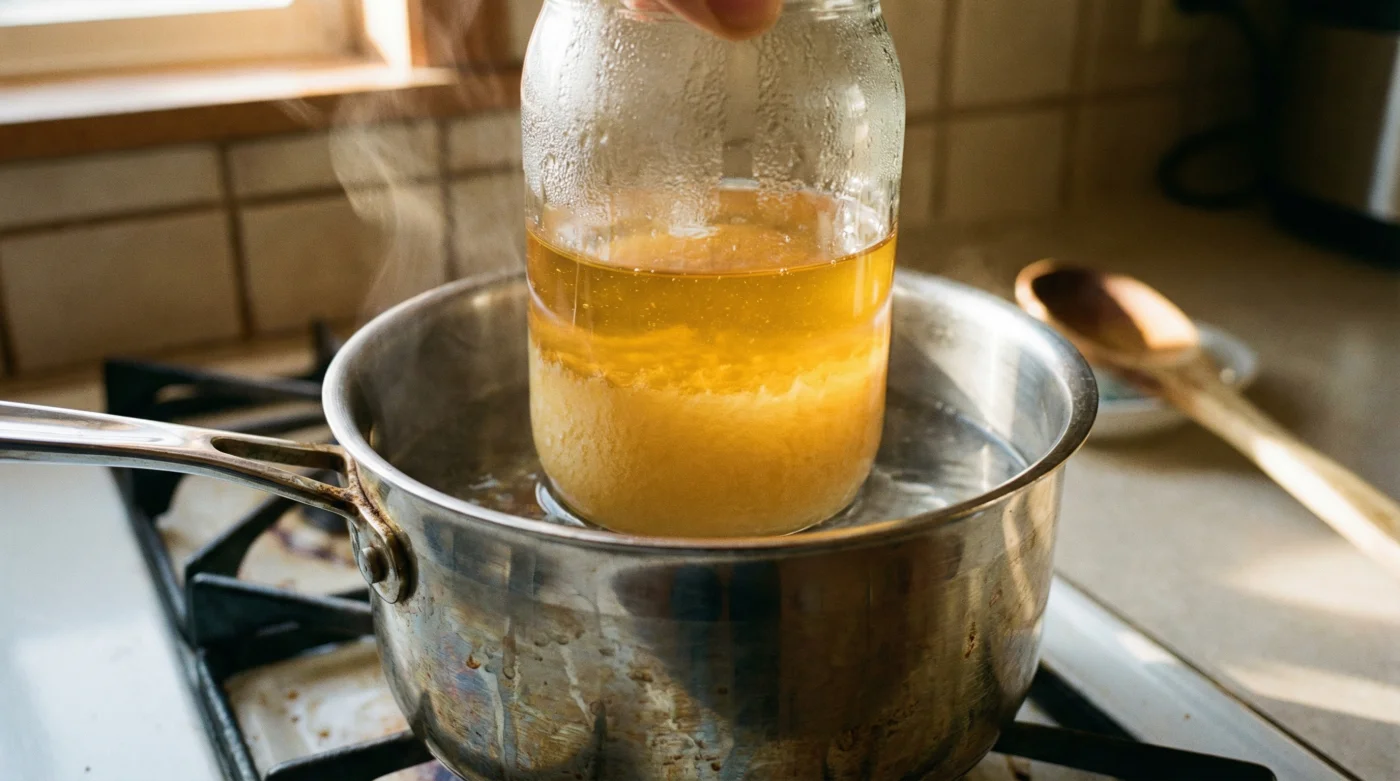 | El Baño Invertido | Inmersión en agua pre-calentada máxima a 45°C, con fuego apagado. | Recupera la textura de seda protegiendo la inversión de tu miel cruda. |